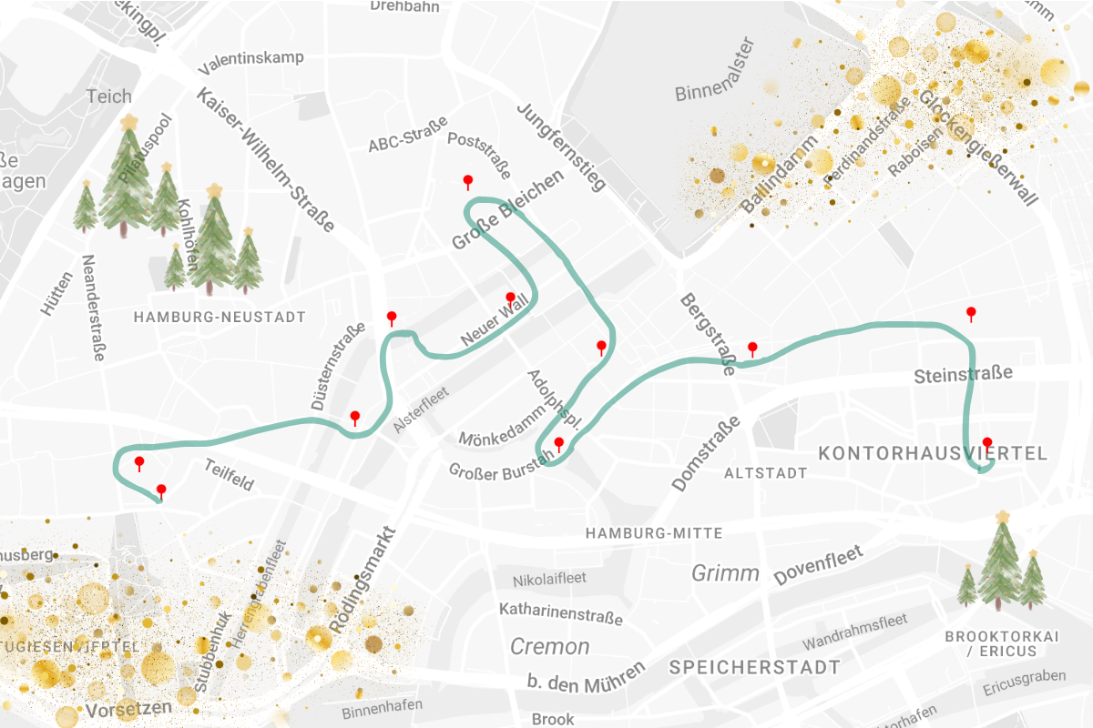 It’s beginning to look a lot Like Christmas … Höchste Zeit für Glühwein, Schmalzgebäck und einen Sonntagsspaziergang im Advent durch die festlich erleuchtete Innenstadt von Hamburg. Himmlische Panoramablicke, versteckter Weihnachtsbaumzauber, glitzernde Sternenhimmel: Dies ist eine Einladung zu einer geführten Route voller magischer Highlights und versteckter Überraschungen…