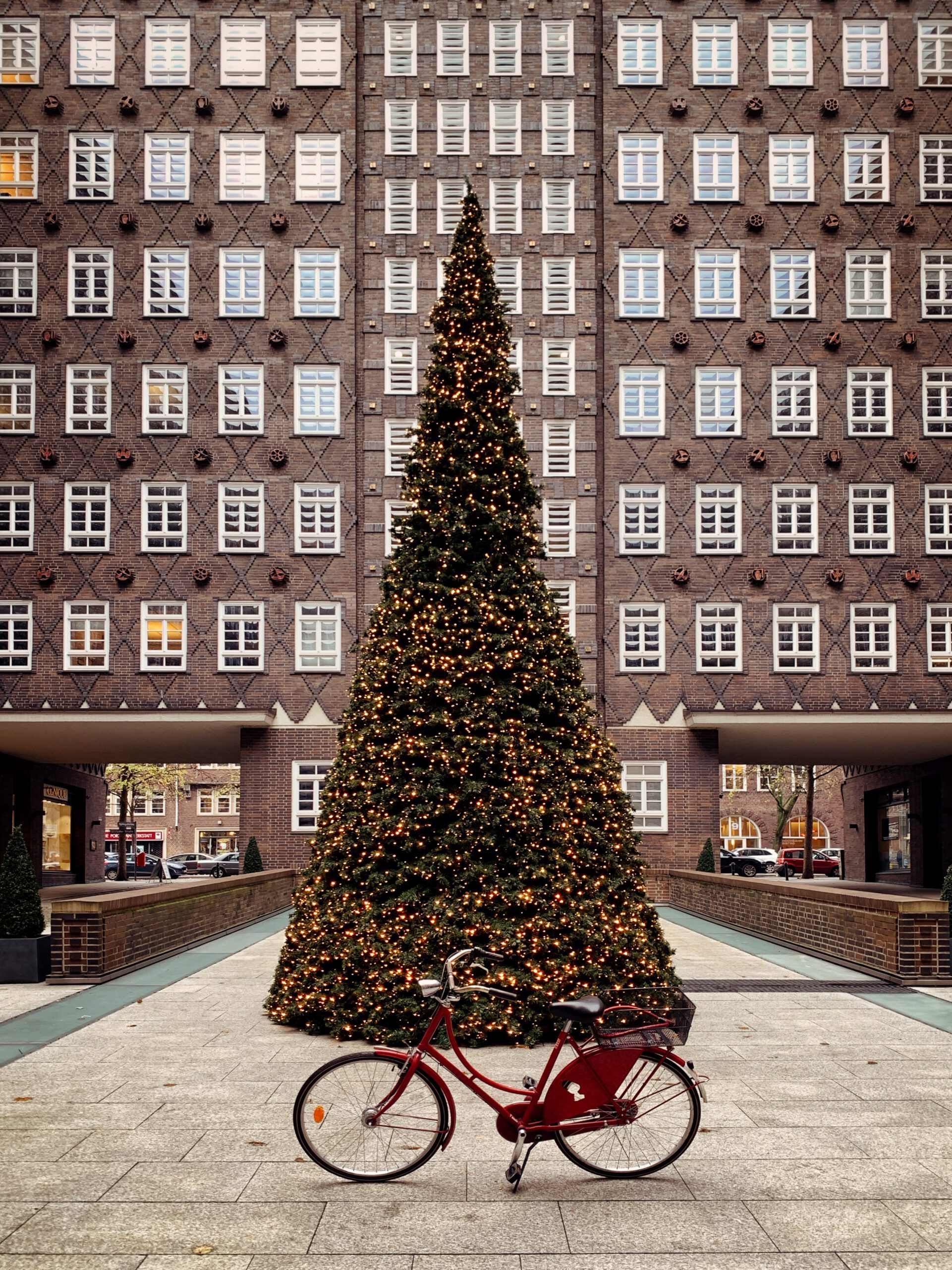 Los geht unser weihnachtlicher Spaziergang mit einem echten Geheimtipp: Dem festlich erleuchteten Innenhof des Sprinkenhofs. Dort steht ein Weihnachtsbaum, den ich jedes Jahr ein bisschen mehr ins Herz schließe – wie er zwischen all dem Backsteinexpressionismus vor sich hin glitzert. Dass er keine echte Tanne ist? Egal! Mit seiner ehrgeizigen Dreiecksform passt er irgendwie perfek…